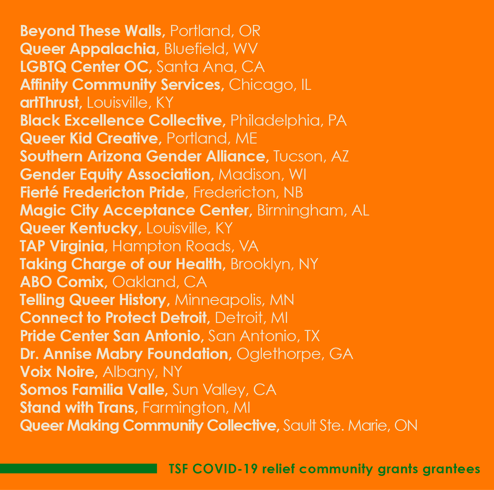 The Tegan and Sara Foundation are honored and excited to announce the recipients of our 2020 TSF Community Grants! These 23 organizations across the U.S. and Canada are directly responding to the needs of LGBTQ+ people in their community through arts, education, mental health support, and more.